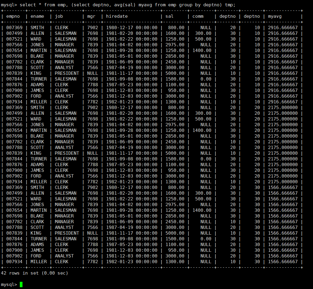 - 子查询语句出现from子句中,其查询结果将会被当作一个临时表使用。