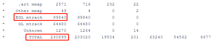 ①进程Total PSS:neuronrt期间执行“dumpsys meminfo + {process name}”命令,会得到neuronrt进程的Total PSS值以及EGL mtrack值: