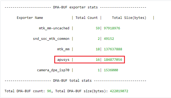 Neuronrt连续推理期间执行“dmabuf_dump -b”命令,关注DMA-BUF exporter stats中Exporter Name为“apusys”栏位中Total Size(bytes):