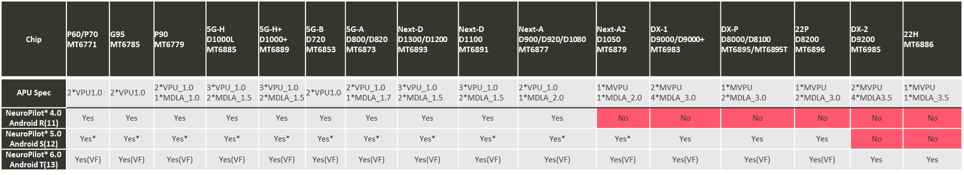 它是由Google在2020年提出的,旨在允许只进行Android系统升级,而不改变Vendor。 Vendor Freeze在Android T (NP6.0, D9200)开始正式实施。在此之前平台,除D9000系列/D8000系列原生支持NP5.0的功能外,其他旧平台(D9000以前的芯片,标记了yes*),仅保留API兼容的支持,并不支持新功能。