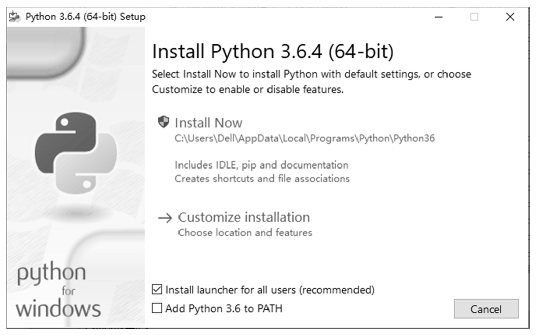 双击python-3.6.4-amd64.exe文件,即可进入安装界面,如图1-14所示。