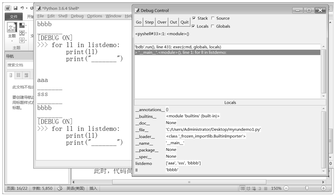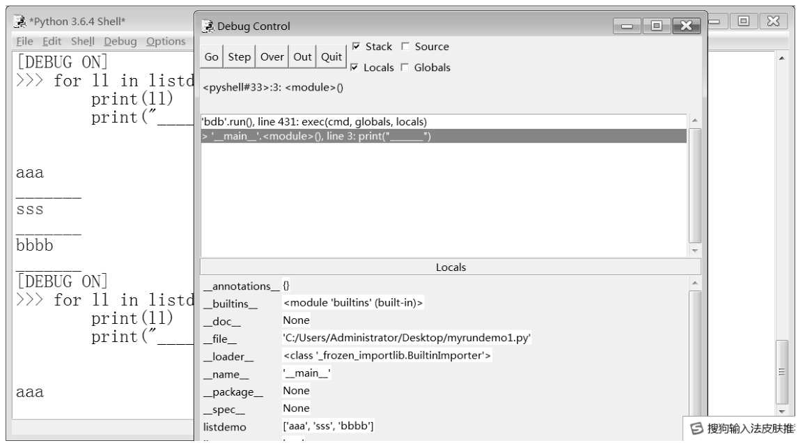 然后切换回Edit模式,选择【Run】→【Run Module】命令,执行运行程序的命令,从而使IDLE正式进入Debug状态。接下来,通过【Debug Control】窗口中的各种单步调试功能来实现单步调试,它们的具体用法与在Shell模式下的用法相同。