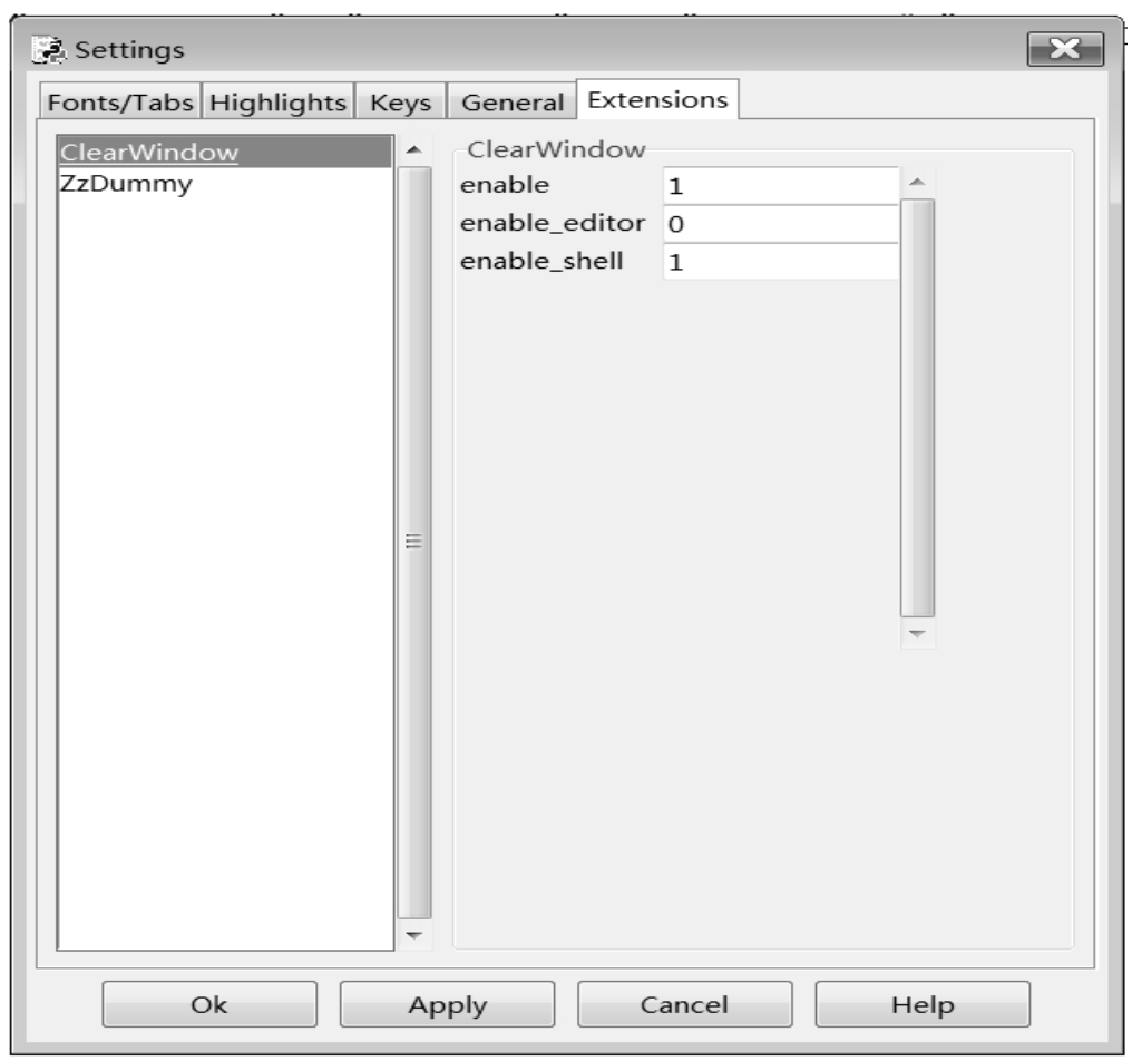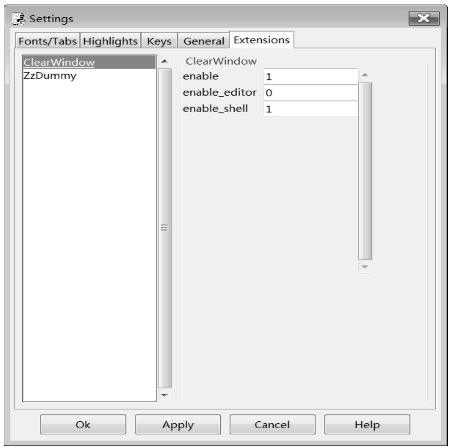 由于增加了一个清屏插件,因此,在【Options】→【Configure IDLE】→【Extensions】下增加了一个ClearWindow插件,如图2-34所示,右侧的选项可以对该插件进行使能/失能的设置:enable=1表示使能,enable=0表示失能(该插件无效)。