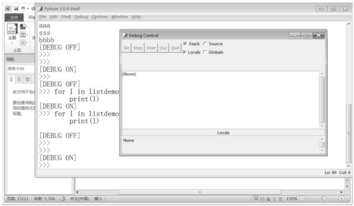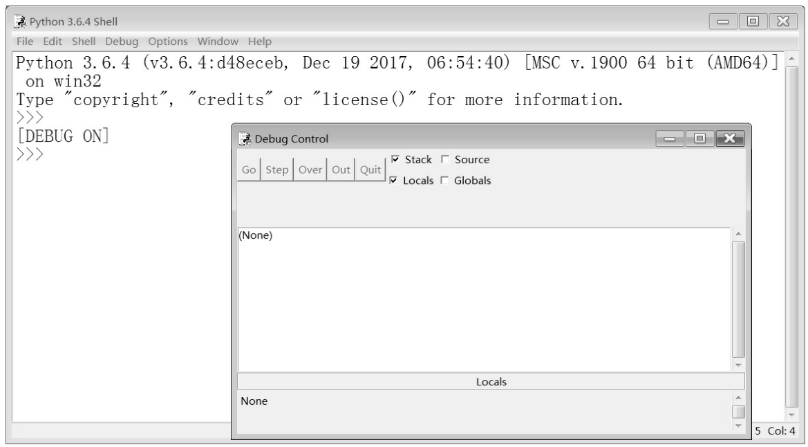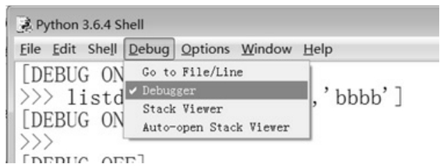 通过菜单【Run】切换到Python的Shell模式,在Shell模式下选择【Debug】→【Debugger】命令,使IDLE进入Debug状态。