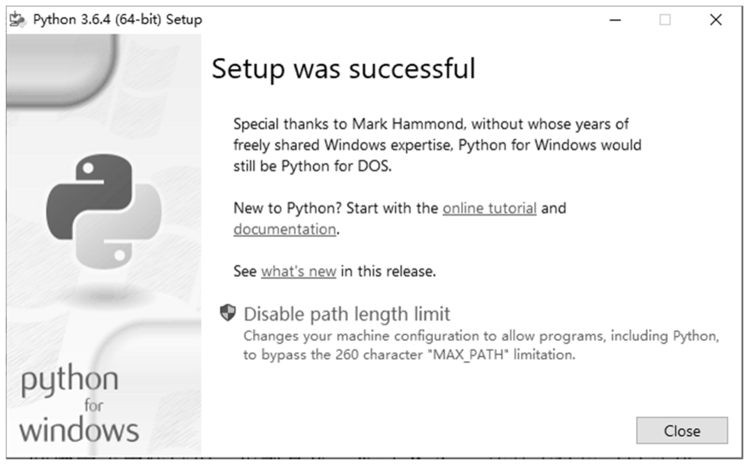 单击【Close】按钮,圆满完成安装过程。也就是说,学习Python的基本环境已经被建立,可以开启学习之路了,这是不是让人有点激动呢?