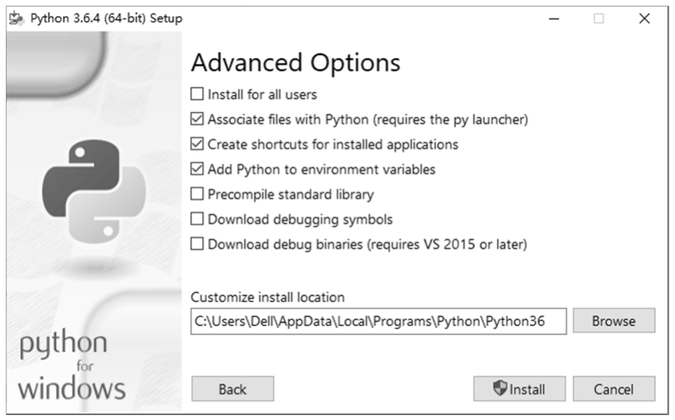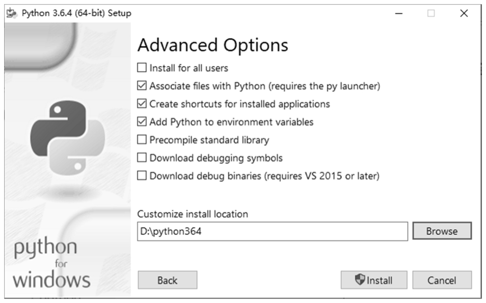 从图1-18中可以看出,默认勾选了3个高级选项,它们分别代表文件关联、快捷键和将Python加入环境变量。如果需要,则可勾选【Install for all users】复选框,此时会自动勾选【Precompile standard library】复选框。【Customize install location】栏目用于自定义安装路径(文件夹)。将【Customize install location】栏目下的路径通过右侧的【Browse】按钮切换为指定的路径“D:\python364”,如图1-19所示。