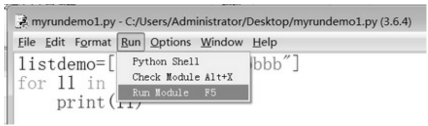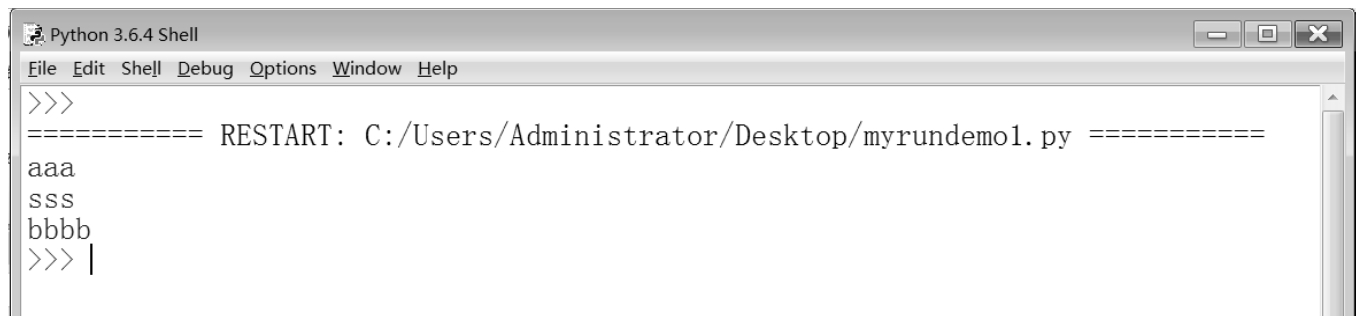然后,选择【Run】→【Run Module】命令(如图2-22所示)或直接按功能键【F5】,运行当前正在被编辑的模块(程序)myrundemo1.py。程序被运行后,其结果会在Shell窗口中输出,如图2-23所示。