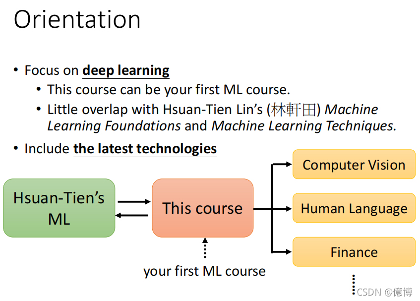 - 关注在深度学习:这门课可以是你的第一堂ML课;这门课与《林轩田机器学习基石》重叠部分很少。