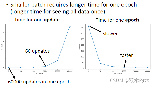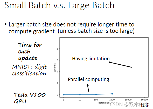 所以当你的 Batch Size 增加到 10000乃至增加到60000的时候,你就会发现 GPU 要算完一个 Batch,把这个 Batch 里面的资料都拿出来算 Loss,再进而算 Gradient,所要耗费的时间确实有随着 Batch Size 的增加而逐渐增长,但你会发现这边用的是 V100,所以它挺厉害的,给它60000笔资料,一个 Batch 里面60000笔资料,它在10秒钟之内把 Gradient 就算出来。