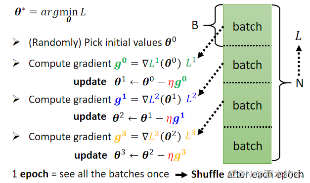 每一个 Batch 的大小,就是B 笔的资料,我们每次在 Update 参数的时候,拿 B 笔资料出来算 Loss,算Gradient,Update 参数;然后拿另外B笔资料,再算Loss,再算Gradient,再 Update 参数,以此类推。所以我们不会拿所有的资料一起去算出 Loss,只会拿一个 Batch 的资料来算 Loss。