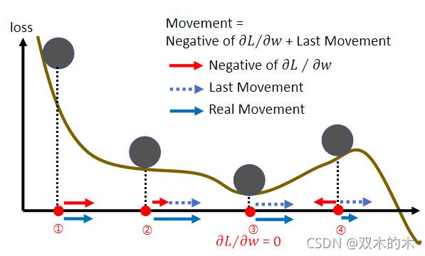但没有关系,如果有 Momentum 的话,你还是有办法继续走下去,因为 Momentum 不是只看 Gradient,Gradient 就算是 0,你还有前一步的方向,前一步的方向告诉我们向右走,我们就继续向右走,甚至你走到红点④,Gradient 告诉你应该要往左走了,但是假设你前一步的影响力,比 Gradient 要大的话,你还是有可能继续往右走,甚至翻过一个小丘,搞不好就可以走到更好 Local Minima,这个就是 Momentum 有可能带来的好处。