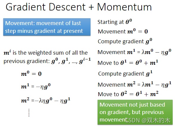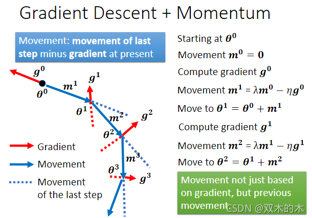 这里λ 和 η (Learning Rate )是我们要调的参数。观察这个式子,(1)一个解读是 Momentum 是Gradient 的负反方向加上前一次移动的方向,(2)那但另外一个解读方式是当加上 Momentum 时,我们 Update 的方向不是只考虑现在的 Gradient,而是考虑过去所有 Gradient 的总和。