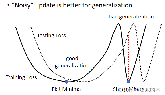 假设实线是 Training Loss,那可能有很多个 Local Minima,那这些 Local Minima 的 Loss 都很低,它们 Loss 可能都趋近于 0,但是这个 Local Minima,还是有好 Minima 跟坏 Minima 之分。如果一个 Local Minima 它在一个峡谷里面,它是坏的 Minima,然后它在一个平原上,它是好的 Minima,为什么会有这样的差异呢?