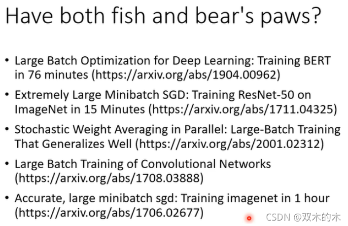 这是有可能的,有很多文章都在探讨这个问题。今天我们不细讲,把Reference 列在这边给大家参考,那你发现这些 Paper,往往它想要做的事情是什么,76分钟训练 BERT,15分钟训练 ResNet?!多大的数据集,一分钟 Train Imagenet 等等。这为什么他们可以做到那么快,就是因为他们 Batch Size 是真的开很大,比如说在第一篇 Paper 的Batch Size 里面有三万个 Example ,真的可以算很快,你可以在很短的时间内看到大量的资料,那他们需要有一些特别的方法来解决,Batch Size 可能会带来的劣势。