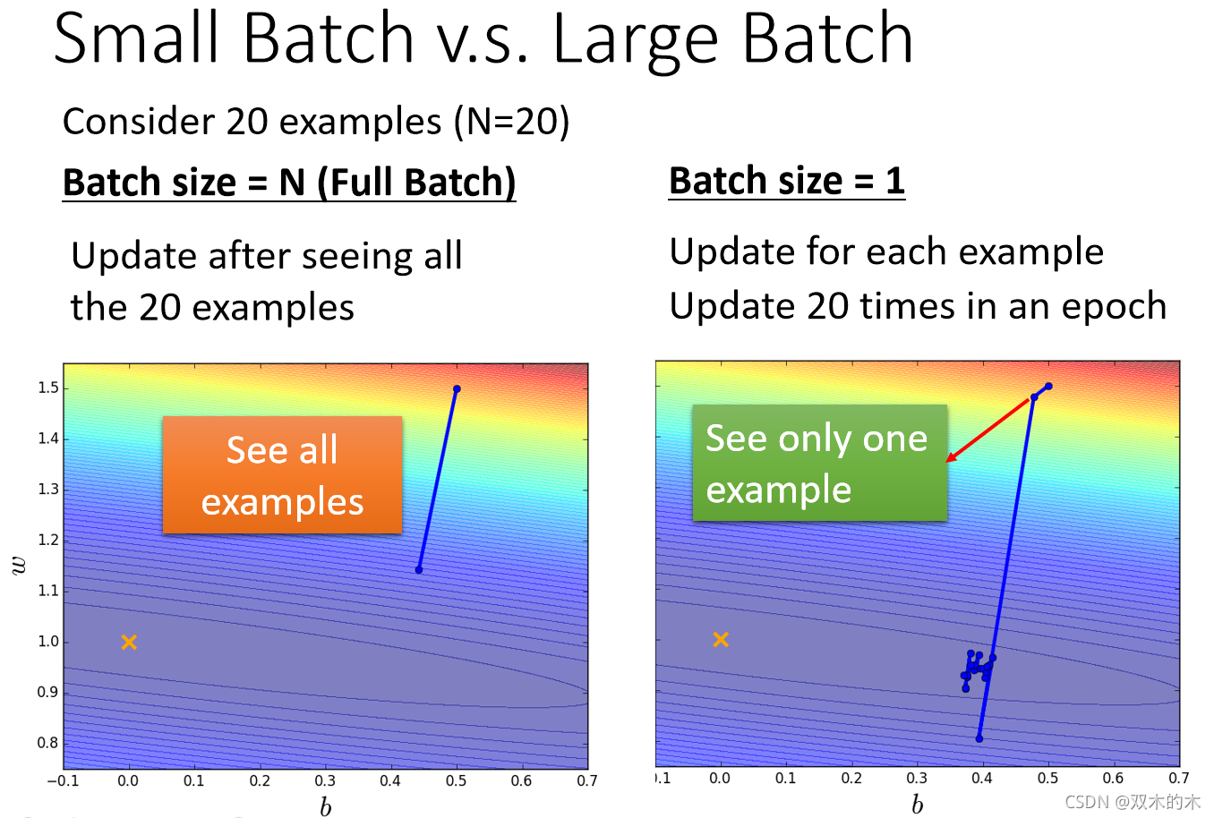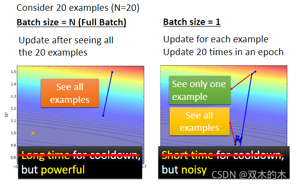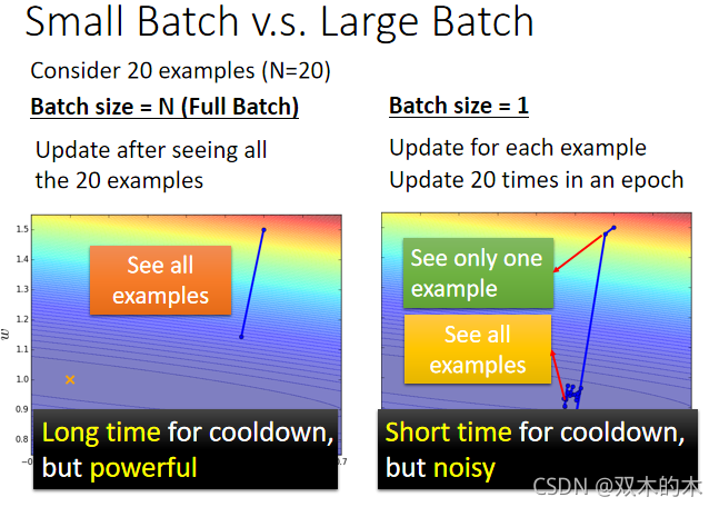 你会发现左边蓄力的时间比较长,它技能冷却的时间比较长,你要把所有的资料都看过一遍,才能够 Update 一次参数,这一步走的是稳的;而右边的方法,Batch Size = 1,蓄力的时间比较短,每次看到一笔资料,就会更新一次参数。这个例子有20个资料,所有资料看过一遍已经更新了20次的参数,但是它每一步走的是不稳的。