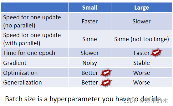 (1)在有平行运算的情况下,小的 Batch 跟大的 Batch,其实运算的时间并没有太大的差距,除非你的大的 Batch 那个大是真的非常大,才会显示出差距来。但是一个 Epoch 需要的时间,小的 Batch 比较长,大的 Batch 反而是比较快的,所以从一个 Epoch 需要的时间来看,大的 Batch 其实是占到优势的。(2)而小 Batch的 Update 的方向比较 Noisy,大Batch 的 Update 的方向比较稳定,但是 Noisy 的 Update 的方向,反而在 Optimization 的时候会占到优势,而且在 Testing 的时候也会占到优势,所以大的 Batch 跟小的 Batch,它们各自有它们擅长的地方。因此 Batch Size变成另外一个你需要去调整的 Hyperparameter。