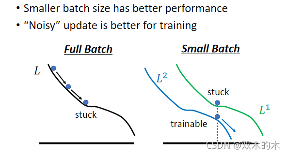 如上图,左边是Full Batch,在 Update 参数时,你用一个Loss Function走到一个 Local Minima,走到一个 Saddle Point,显然就停下来了,Gradient 是零,如果你不特别去看Hession的话,那你用 Gradient Descent 的方法,你就没有办法再更新你的参数了。