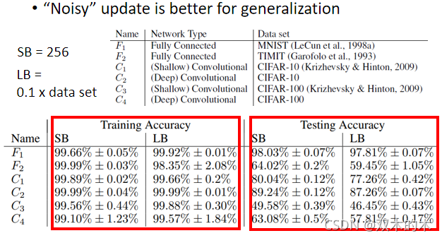 如上图,作者训练了六个 Network ,里面有 CNN和 Fully Connected Network 的,做在不同的 Cover 上,代表这个实验是很泛用的。在很多不同的 Case 都观察到一样的结果,那它有小的 Batch size = 256,大的 Batch size = Data Set 乘 0.1 = 6000。然后想办法,大的 Batch跟小的 Batch都 Train 到差不多的 Training Accuracy。但是Testing 时小的 Batch 居然比大的 Batch 好,这个才是 Over Fitting ,那为什么会有这样子的现象呢?在这篇文章里面也给出了一个解释。