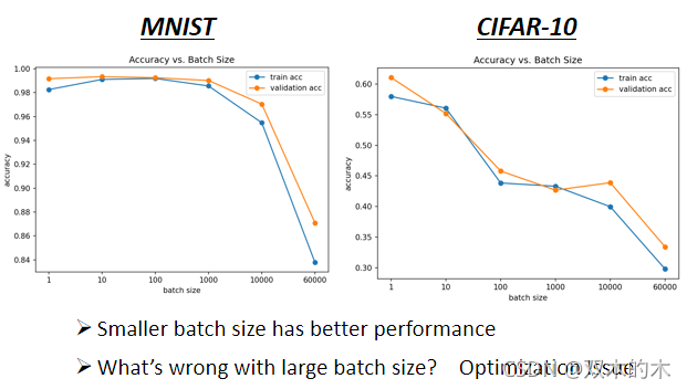 我们还注意到大Batch的 Update 比较稳定,小Batch的 Gradient 的方向比较 Noisy 。神奇的地方是 Noisy 的 Gradient反而可以帮助 Training,这个也是跟直觉正好相反的。如果你今天拿不同的 Batch 来训练你的模型,你可能会得到这样子的结果。如下图所示,左边是 MNIST ,右边是 CIFAR-10 ,两者都是影像辨识的问题。
