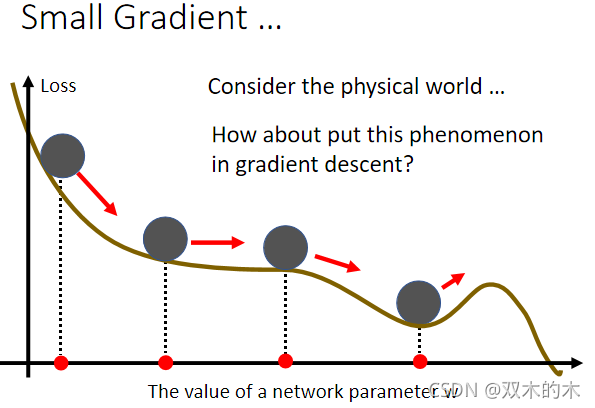 但是在物理的世界里,一个球如果从高处滚下来,从高处滚下来就算滚到 Saddle Point,因为惯性的关系它还是会继续往右走,甚至它走到一个 Local Minima,如果今天它的动量够大的话,它还是会继续往右走,甚至翻过这个小坡然后继续往右走。所以它并不会被 Saddle Point或 Local Minima卡住。我们有没有办法运用这样子的概念到 Gradient Descent 里面呢?这个就是我们要讲的Momentum 这个技术。