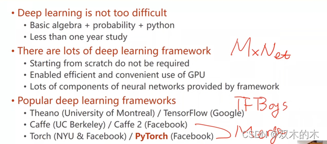 这么课主要讲PyTorch。讲解PyTorch的原因?PyTorch出现的时候主打动态图,动态图就是计算的时候把图计算出来,计算完就把图释放,所以每一次可以构造出不同的图,对于写神经网络非常方便。学术界主打PyTorch,工业界用TensorFlow比较多,TensorFlow最新的版本现在也是动态图了。