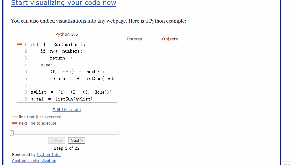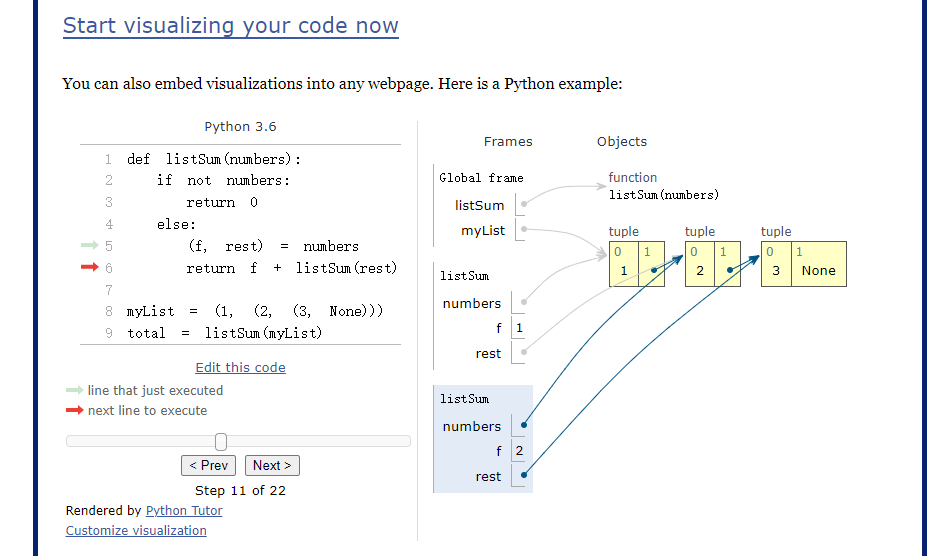 左边是一段 Python 代码,右边则是对应的运行逻辑,变量值等信息,我们点击下方的Prev和Next按钮,就会产生联动的效果。