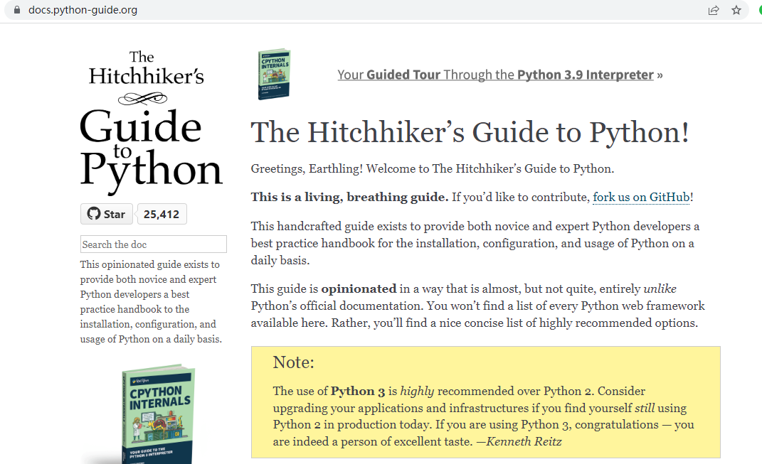 这里再介绍一个英文网站,这是一个开源在 GitHub 上的 Python 教程,由众多大牛共同维护着,也是学习 Python 路上的良好助力,这是 GitHub 地址:https://github.com/realpython/python-guide。