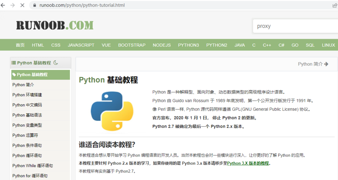 菜鸟教程其实同样的大名鼎鼎,相信有太多的小伙伴的自学之路都是从这个网站开始的,不仅仅是 Python,任何主流的编程相关的技术都可以在这里找到!