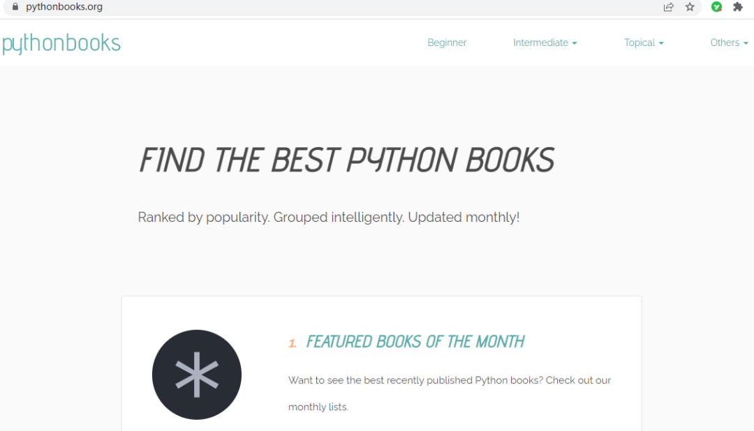 最后,再介绍一个有趣的网站(https://pythonbooks.org/),该网站提供了大量 Python 书籍,并按照流行程度来排名,还可以根据不同功能来分组,排名每个月更新一次,经常来逛逛,对于提升 Python 水平还是很有必要的!
