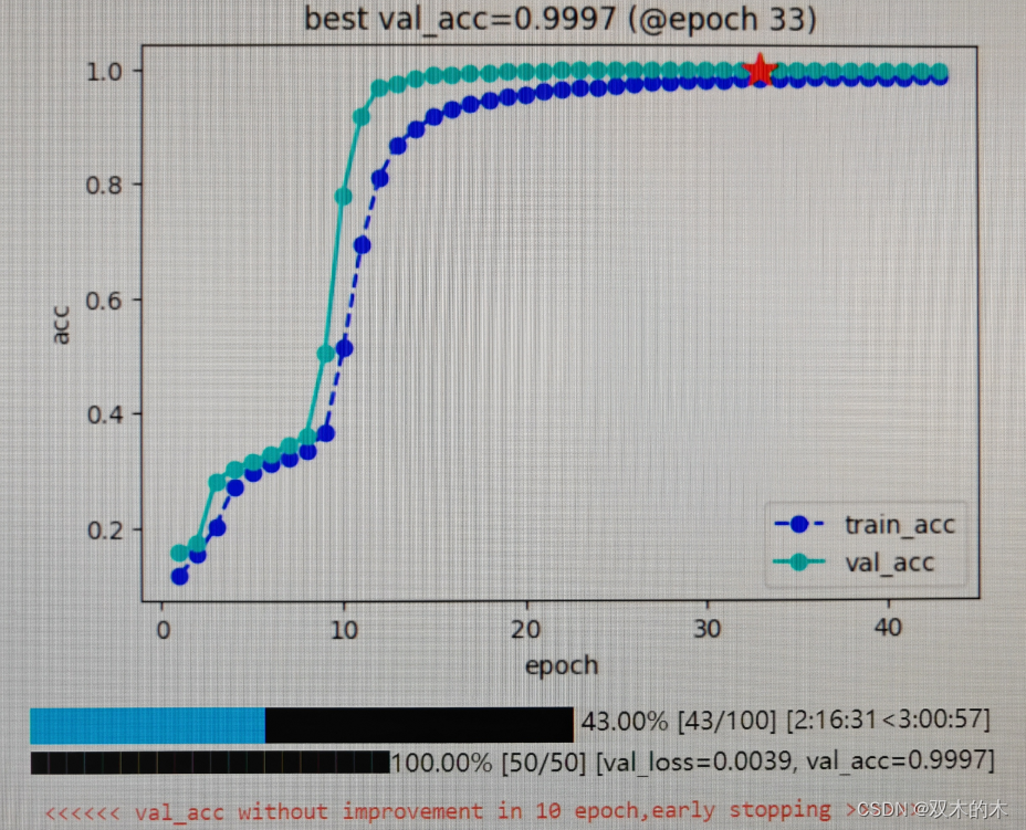 不知道为什么,我的训练结果没有博主好,best val_acc=0.9997。结果的文字输出: