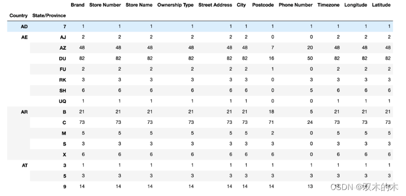 # 设置多个索引,set_index() starbucks.groupby(['Country', 'State/Province']).count()