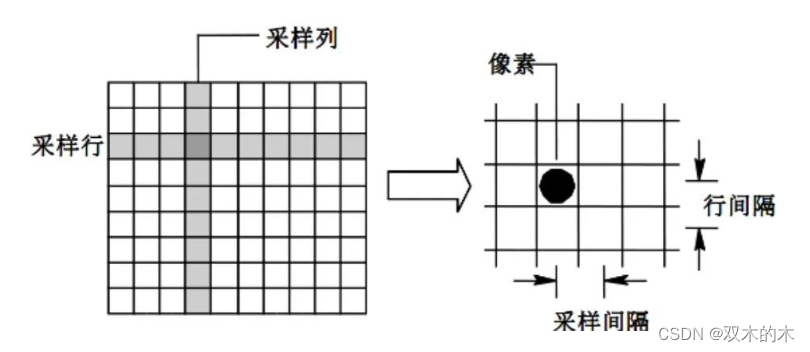 采样把一幅连续图像在空间上分割成 M×N 个网格,每个网格用一亮度值来表示。一个网格称为一个像素。M×N 的取值满足采样定理。