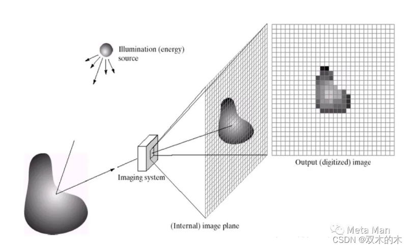 综合而言的数字化过程如下图所示,其表示的是从图像的真实来源,到最后的数字图像: