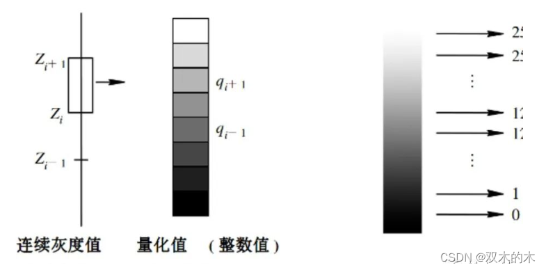 量化后,图像就被表示成一个整数矩阵。每个像素具有两个属性:位置和灰度。位置由行、列表示。灰度表示该像素位置上亮暗程度的整数。此数字矩阵M×N就作为计算机处理的对象了。灰度级一般为0-255(8bit量化)。下图表示的是如何将连续的转化为离散的情况。
