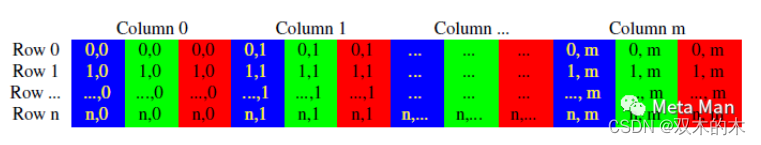 M、N分别表示图像的行列数,三个M x N的二维矩阵分别表示各个像素的R、G、B三个颜色分量。RGB 图像的数据类型一般为8位无符号整形,通常用于表示和存放真彩色图像,当然也可以存放灰度图像。