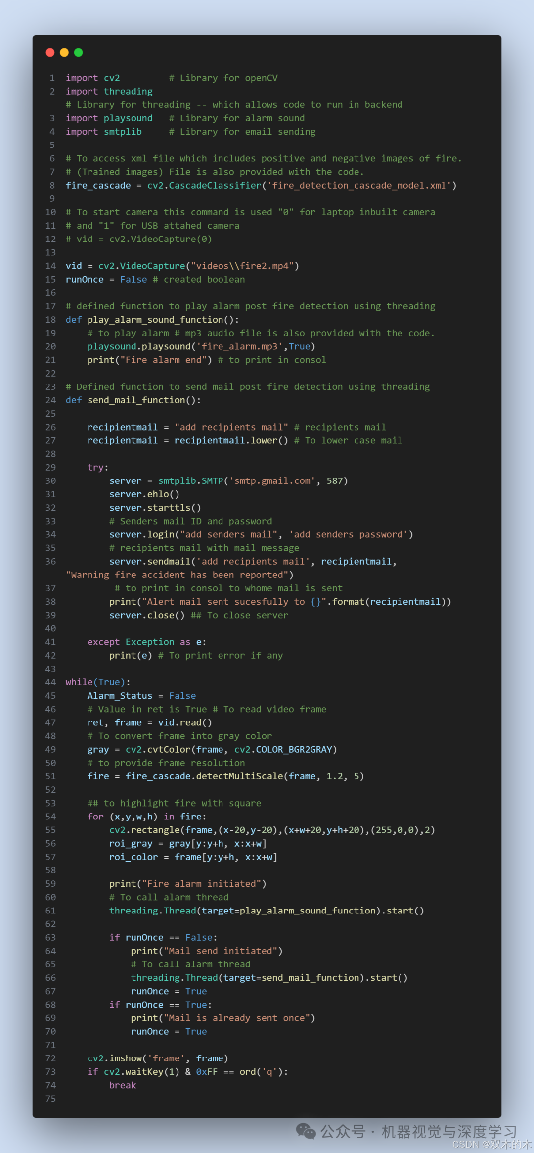 简而言之,此代码读取视频帧,在帧中查找火灾,如果检测到火灾,它会播放警报声音并发送电子邮件警报。它使用单独的线程来播放警报和发送电子邮件,因此这些任务不会阻塞主视频处理循环。