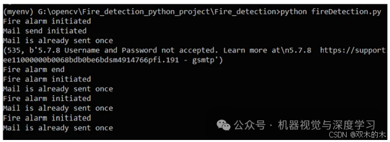 5. 发送电子邮件:send_mail_function()定义了另一个函数来发送电子邮件。它使用 Gmail 的 SMTP 服务器向指定收件人发送有关火灾检测的警告电子邮件。代码中需要提供发件人的电子邮件和密码。