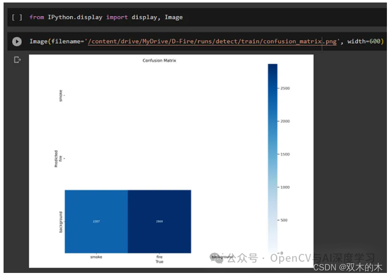 Image(filename='/content/drive/MyDrive/D-Fire/runs/detect/train/confusion_matrix.png', width=600):这一行创建一个Image对象并指定我们要显示的图像文件的路径。在本例中,图像文件位于/content/drive/MyDrive/D-Fire/runs/detect/train/confusion_matrix.png.该width=600参数将显示图像的宽度设置为600像素,它控制显示时图像的大小。