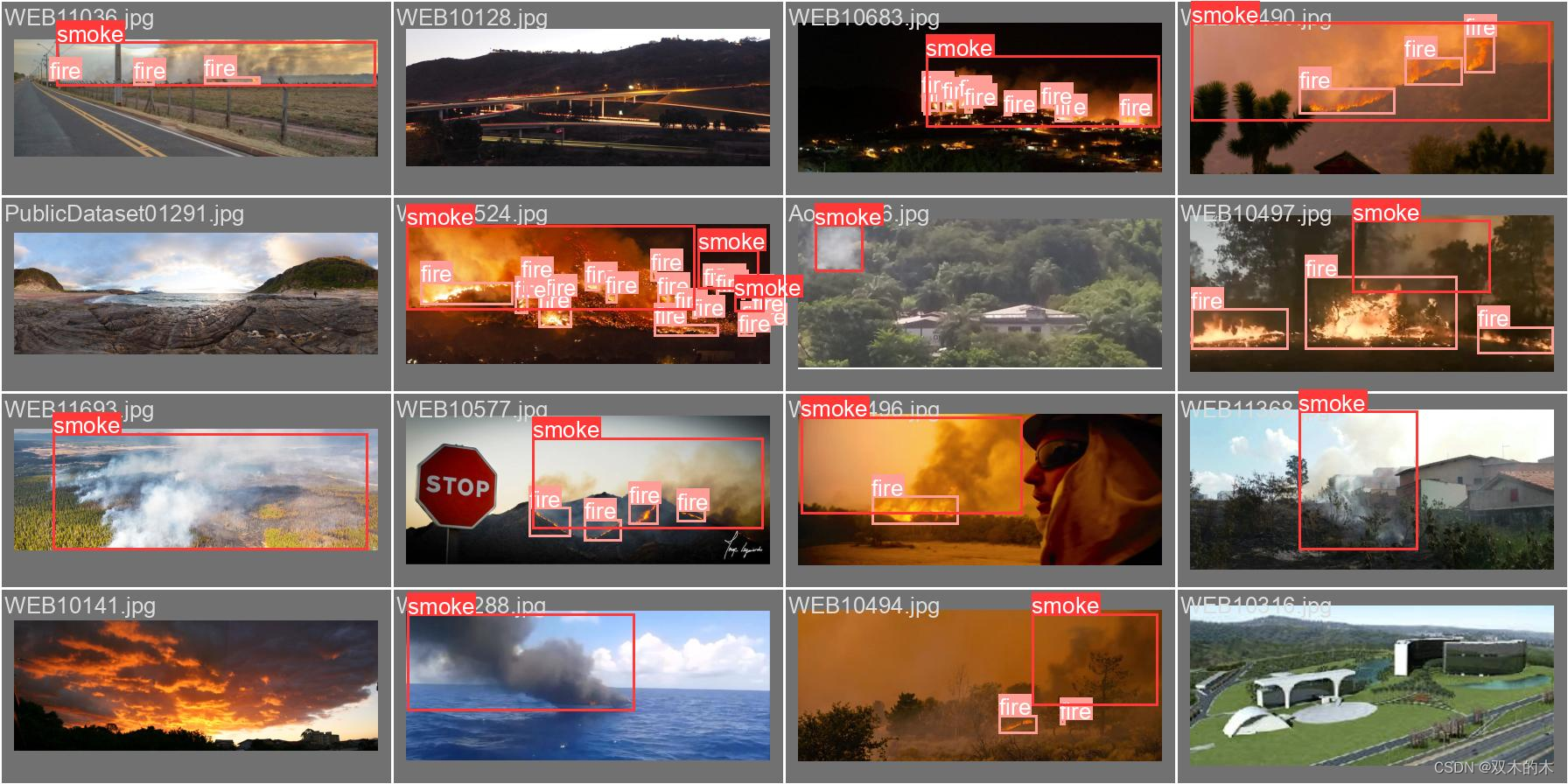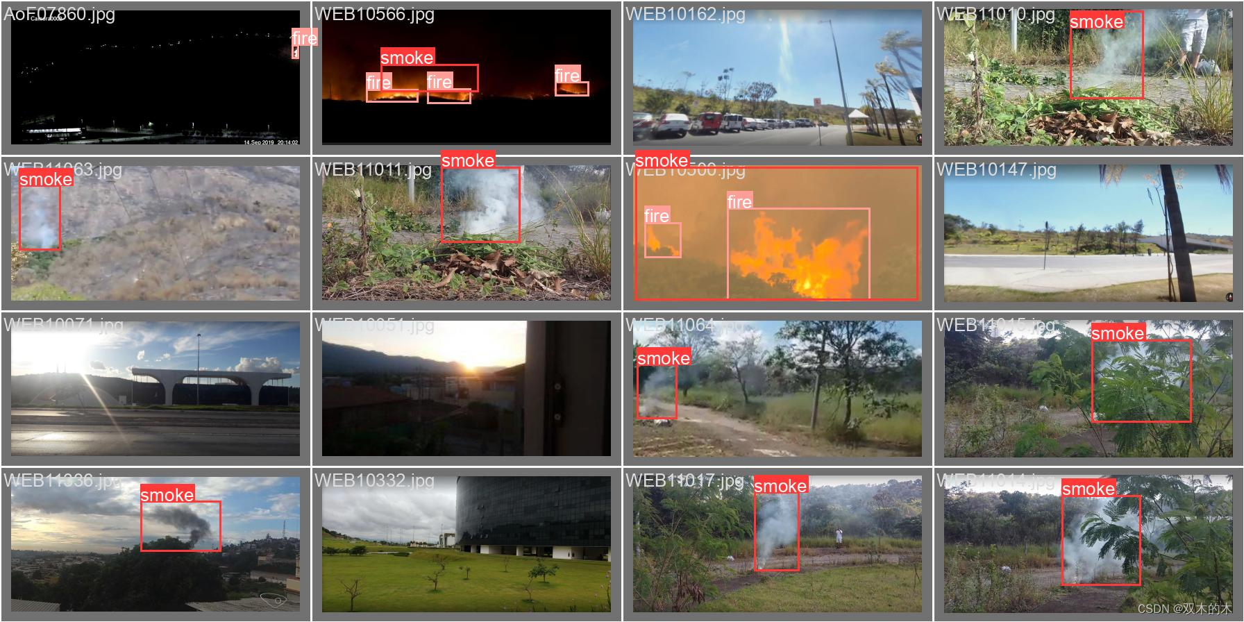 names: ['smoke', 'fire']:此行提供数据集中类的名称。列表中的每个元素对应一个类标签。在本例中,列表包含两个元素:“smoke”和“fire”。这些标签用于识别和区分模型正在学习检测或分类的对象。