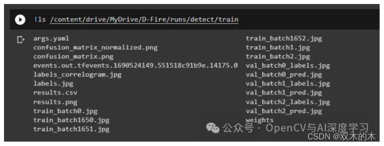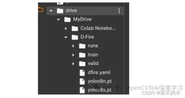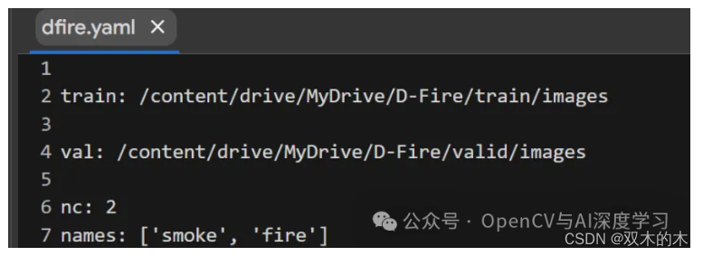 train: /content/drive/MyDrive/D-fire/train/images:此行指定包含训练图像的目录的路径。该模型将在训练过程中使用这些图像来学习和提高其检测或分类对象的能力。