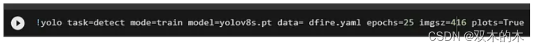 !yolo task=detect mode=train model=yolov8s.pt data= dfire.yaml epochs=25 imgsz=416 plots=True