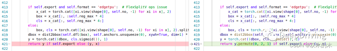 这样的通道排列顺序有个问题,那就是后处理的时候会造成内存访问不连续。为了解决这个问题,我们可以修改一下代码,具体做法是把ultralytics/nn/modules.py文件中的421行做如下修改,交换一下张量y的通道顺序: