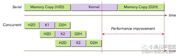 这些操作都会在一个CUDA流中运行,如果显式地创建一个流那么这个流就是显式流(非空流)否则就是隐式流(空流),前面文章介绍的CUDA例程都是在隐式流中运行的。如果显式地创建多个流分别去执行上述3个操作步骤,那么不同的CUDA操作是可以重叠进行的,参考下图: