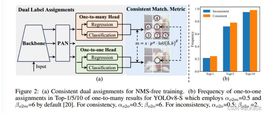 由于篇(知)幅(识)有(盲)限(区),今天我们就讲到这。回到今天的主角,YOLOv10 的一大创新点便是引入了一种双重标签分配策略,其核心思想便是在训练阶段使用一对多的检测头提供更多的正样本来丰富模型的训练;而在推理阶段则通过梯度截断的方式,切换为一对一的检测头,如此一来便不在需要 NMS 后处理,在保持性能的同时减少了推理开销。