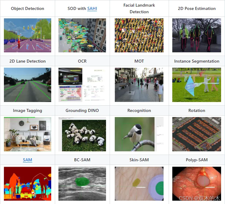 支持各类视觉任务,如图像分类、目标检测、实例分割、姿态估计、旋转检测、多目标跟踪、光学字符识别、图像文本描述、车道线检测、分割一切系列等。