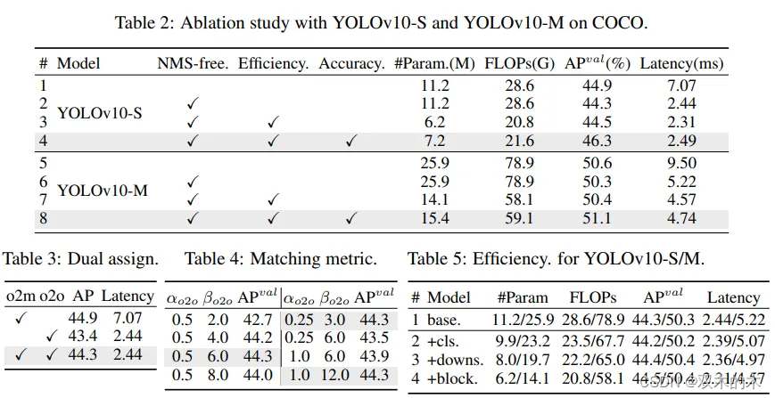 这里重点看下表3,可以看出,采用一对多的检测头性能最好(提供了更丰富的正样本监督信号),但延迟也高了许多(需要 NMS 做后处理);另外方面,一对一的检测头则性能会稍微下降,但延迟却低了不少;最终综合利用两者的优势能达到一个最优的精度-速度折衷。