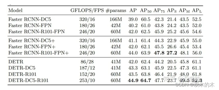 Faster RCNN-DC5是指的resnet的最后一个stage采用空洞率=stride设置代替stride,目的是在不进行下采样基础上扩大感受野,输出特征图分辨率保持不变。+号代表采用了额外的技巧提升性能例如giou、多尺度训练和9xepoch训练策略。可以发现detr效果稍微好于faster rcnn各种版本,证明了视觉transformer的潜力。但是可以发现其小物体检测能力远远低于faster rcnn,这是一个比较大的弊端。