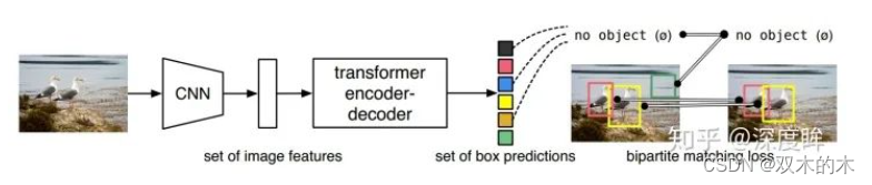 对于目标检测任务,其要求输出给定图片中所有前景物体的类别和bbox坐标,该任务实际上是无序集合预测问题。针对该问题,detr做法非常简单:给定一张图片,经过CNN进行特征提取,然后变成特征序列输入到transformer的编解码器中,直接输出指定长度为N的无序集合,集合中每个元素包含物体类别和坐标。其中N表示整个数据集中图片上最多物体的数目,因为整个训练和测试都Batch进行,如果不设置最大输出集合数,无法进行batch训练,如果图片中物体不够N个,那么就采用no object填充,表示该元素是背景。