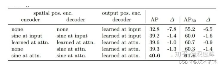 作者对比了不同类型的位置编码效果,因为query_embed(output pos)是必不可少的,所以该列没有进行对比实验,始终都有,最后一行效果最好,所以作者采用的就是该方案,sine at attn表示每个注意力层都加入了sine位置编码,相比仅仅在input增加位置编码效果更好。
