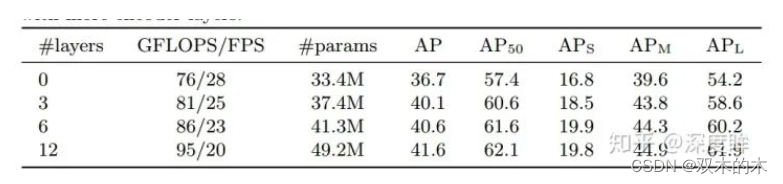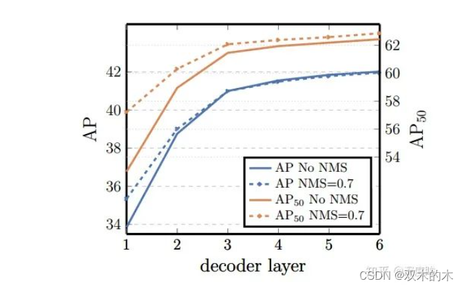 可以发现解码器也是越多越好,还可以观察到第一个解码器输出预测效果比较差,增加第二个解码器后性能提升非常多。上图中的NMS操作是指既然我们每个解码层都可以输入无序集合,那么将所有解码器无序集合全部保留,然后进行nms得到最终输出,可以发现性能稍微有提升,特别是AP50。